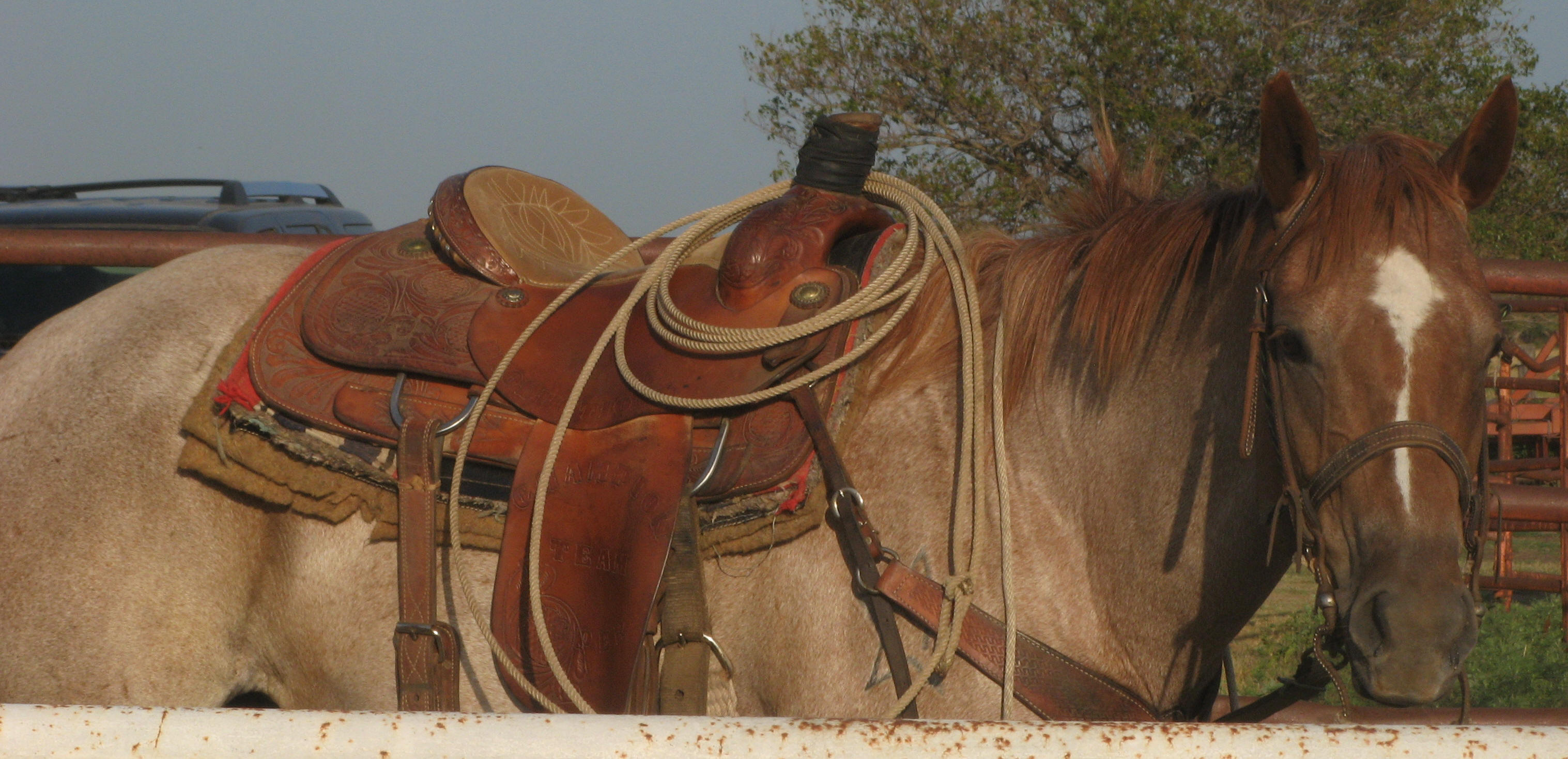 Rebecca MD Dash, aka Reba, is a red roan mare. She is registered AQHA (#4573217). She was born May 2004.