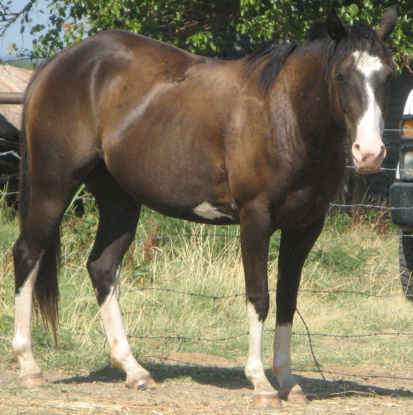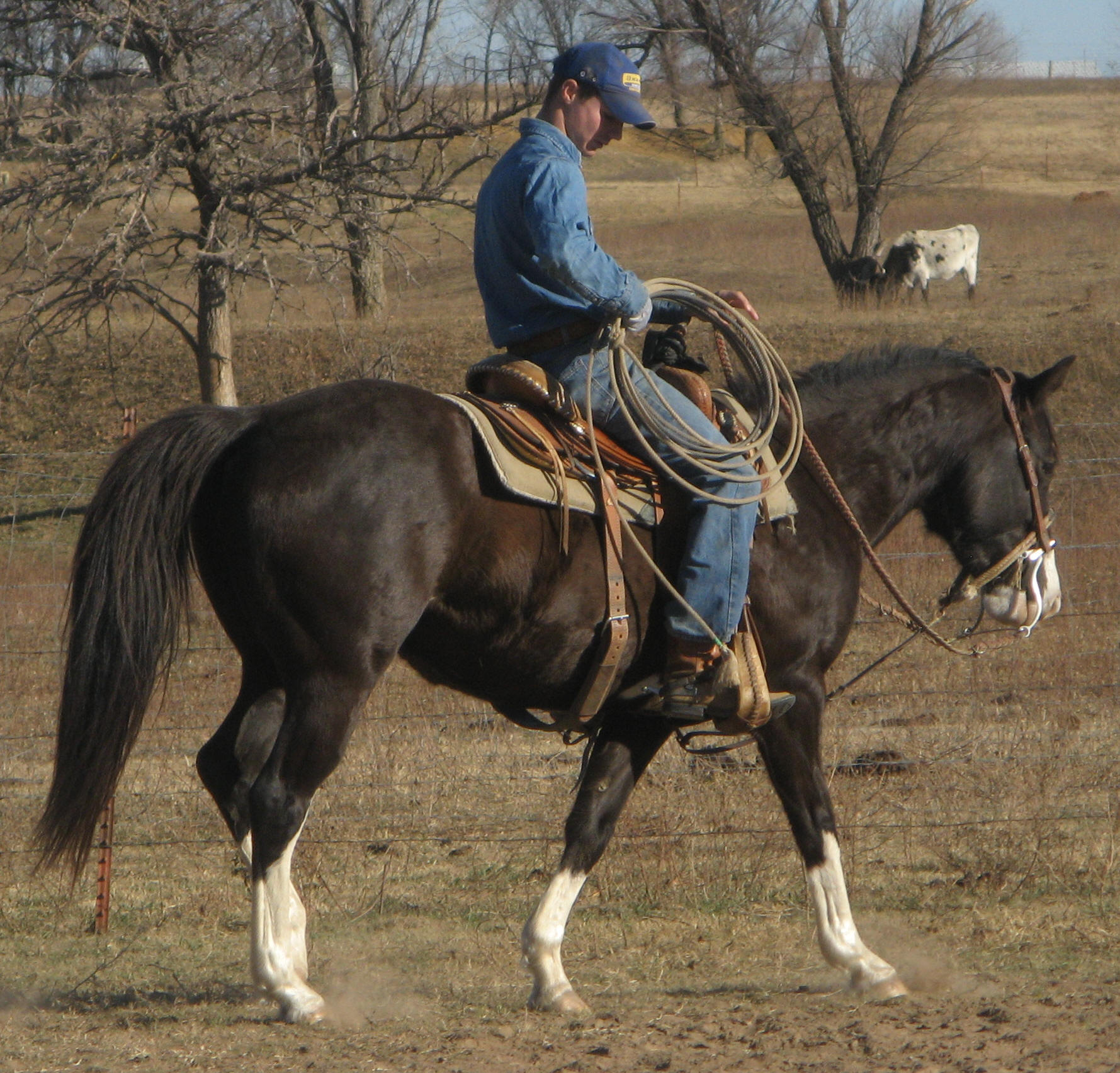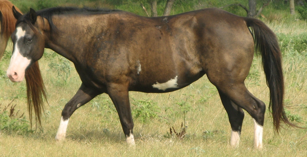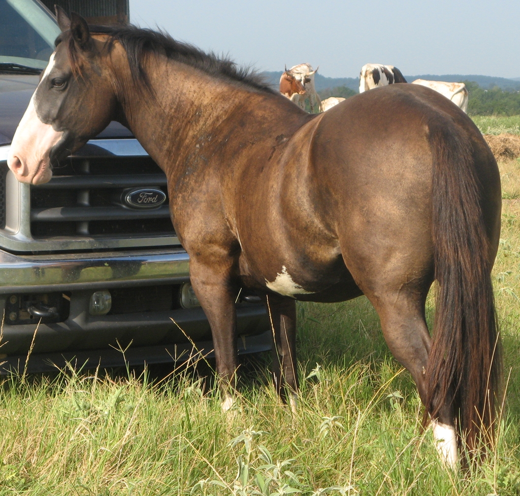 Zans Twinkle Hancock, aka Twinkie, is a black overo mare. She is registed APHA (#840874). This paint mare was born March 2005 and is a really gentle, laid-back horse. Twinkie is 14 hands tall. She is a finished heel horse.